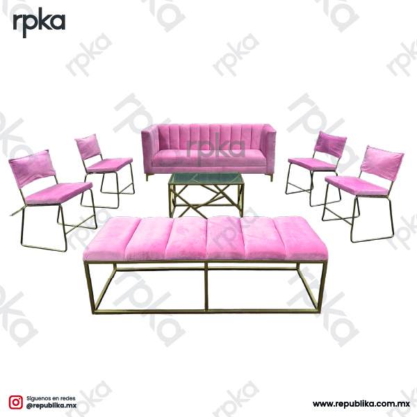 Añade un toque de modernidad y elegancia a tu evento con nuestra sala Gaudi de tela rosa, disponible para renta en Ciudad de México con Republika, especialistas en mobiliario de lujo para eventos. Este conjunto, diseñado para 10 personas, es ideal para bodas, eventos corporativos, lounges o celebraciones que busquen un estilo contemporáneo y sofisticado en CDMX.